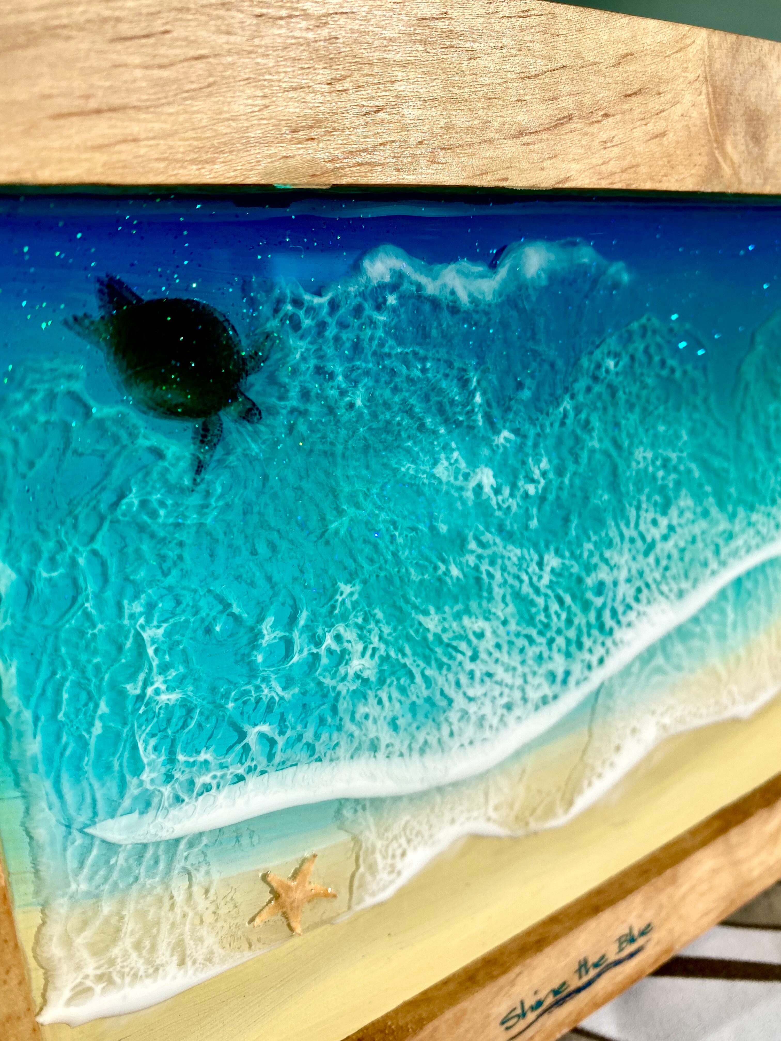 外寸21㎝×16.5㎝のフォトフレームサイズです。 ブルーグリーンのビーチにホヌを漂わせてみました。