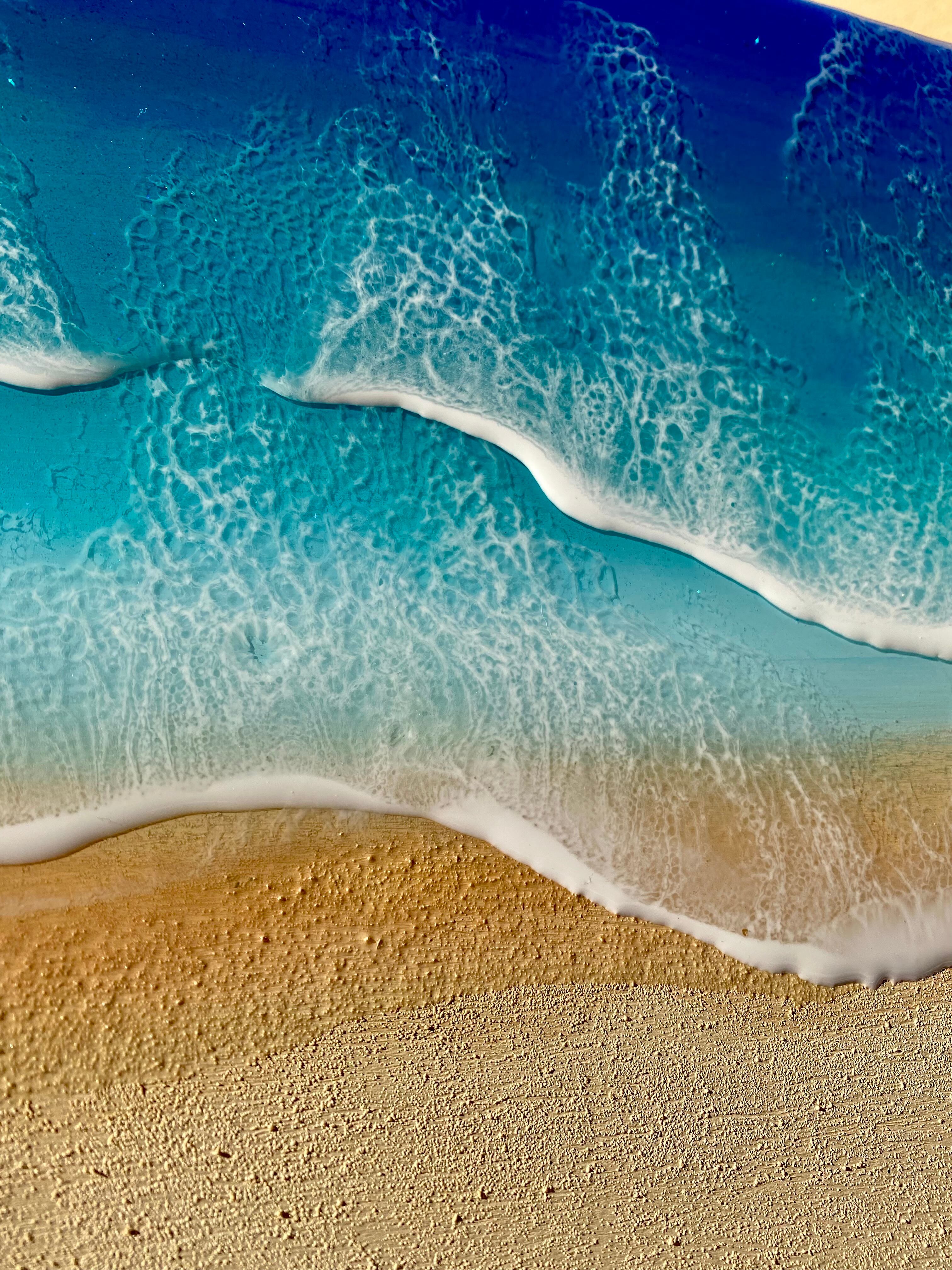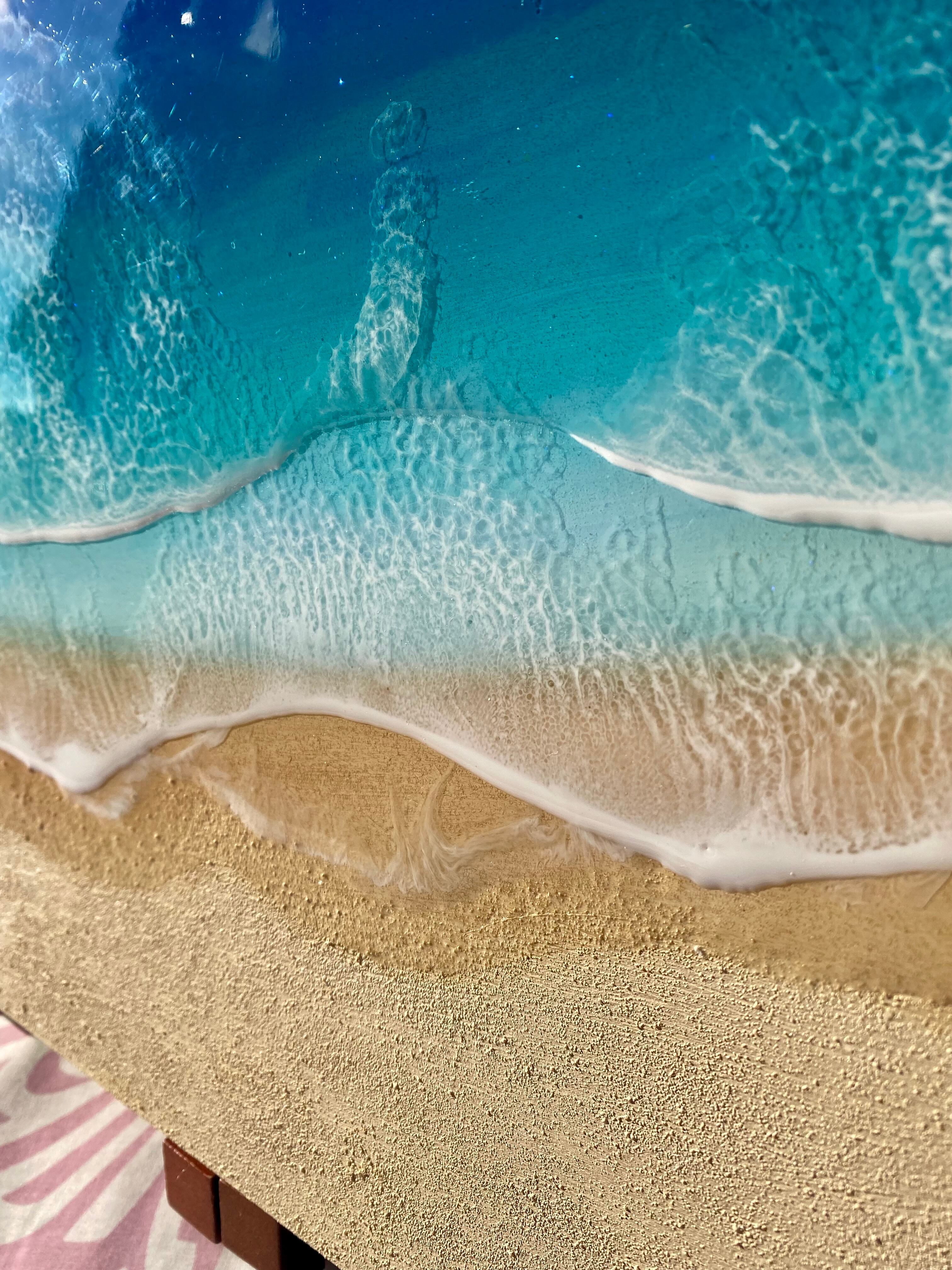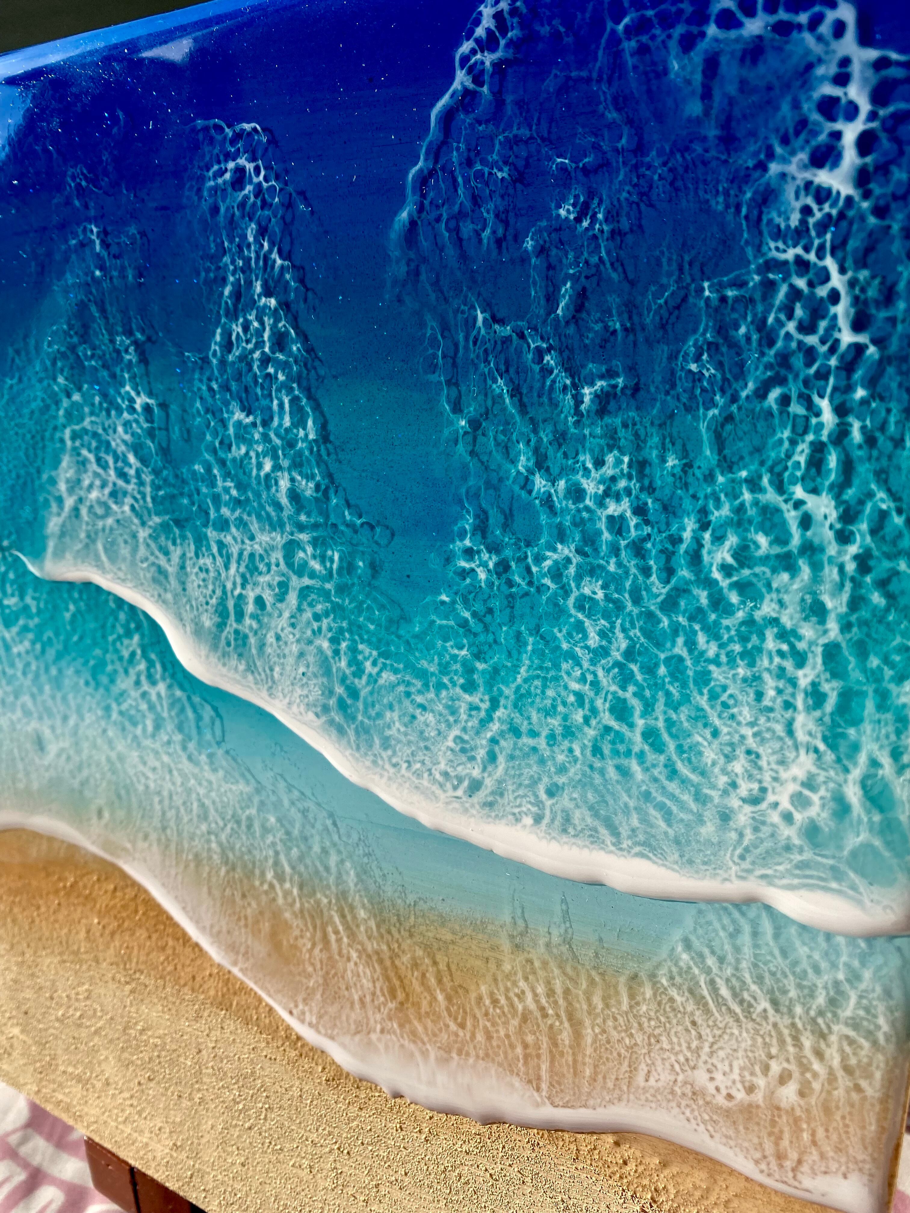 各24㎝×24㎝の2枚セットの波アート作品です。 レジンを3層重ねてビーチに打ち寄せる柔らかい波を表現しました。 ※イーゼルは付属しません