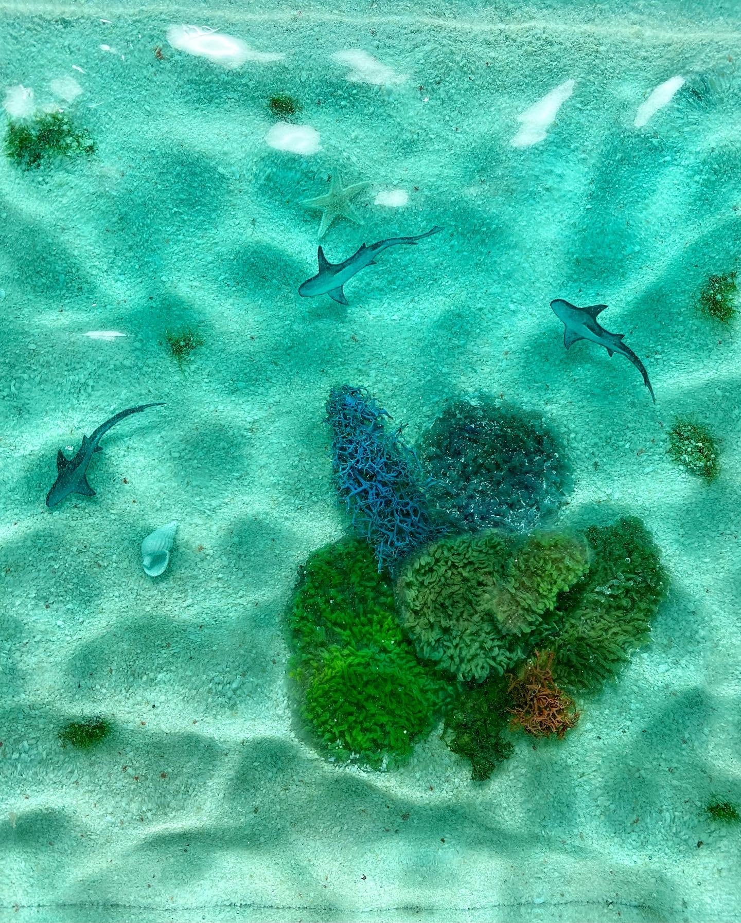 この作品は、アーティストが一つ一つ心を込めて制作しました。リアルな珊瑚や波模様と潜むサメの姿を再現しています。手作業による特殊な技法で作られたエポキシ樹脂は、輝きを放ち、光の屈折によって水面が揺らぎ、まるで海の中に身を置いているかのような臨場感を演出します。